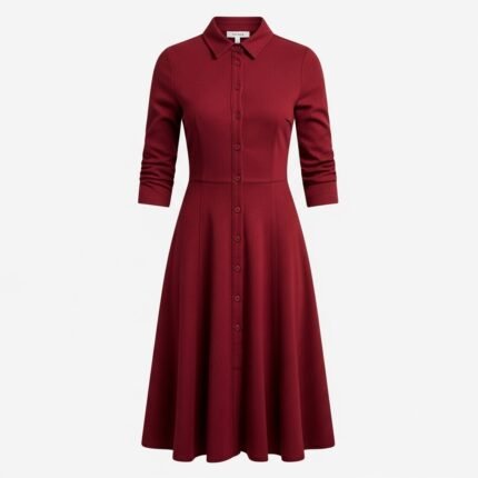 Xylvra Burgundy Red Midi Shirt Dress | Textured Button-Through Fit & Flare