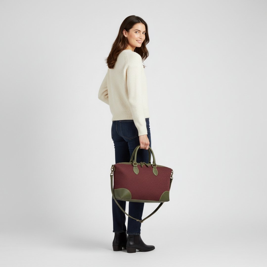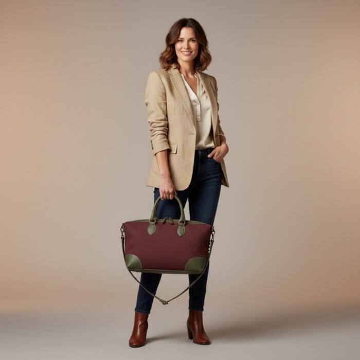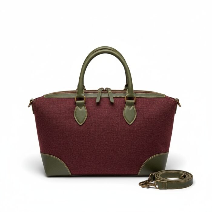 In-Depth Details: Feel the sophisticated embrace of the high-quality tweed, interwoven with precision, offering a unique tactile experience that sets this tote apart from fleeting trends. Then, trace your fingers over the smooth, substantial genuine leather — in a rich dark olive green that perfectly complements the deep maroon tweed — forming the base, trim, and comfortable top handles. This isn’t just about aesthetics; it’s about intelligent design. The leather base provides a sturdy foundation, allowing your bag to stand proudly, safeguarding its contents and maintaining its refined form even when set down on a coffee shop floor or a busy desk. Listen for the satisfying, fluid glide of the top zipper – a testament to superior engineering that ensures both security and effortless access. Every stitch, every perfectly aligned seam, speaks volumes of the meticulous craftsmanship involved, creating a piece that feels luxurious, robust, and utterly dependable. This is a bag designed not just to be carried, but to be truly lived with, enduring beautifully through countless seasons.