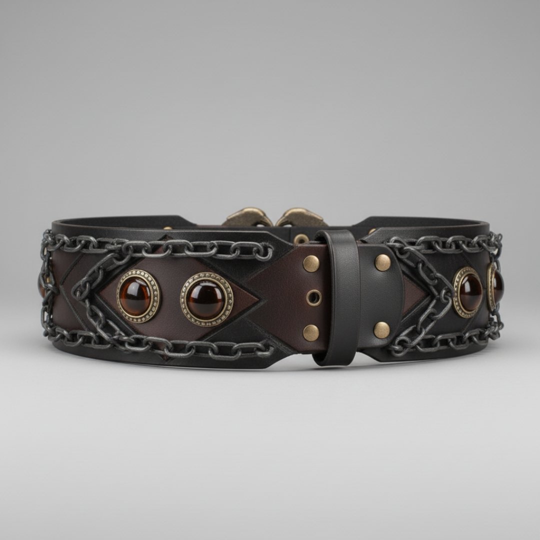 Dark Amber Glass Cabochons: Set into the leather at precise intervals, these polished glass stones glimmer with deep, warm undertones, adding subtle drama and depth to the belt’s dark palette.