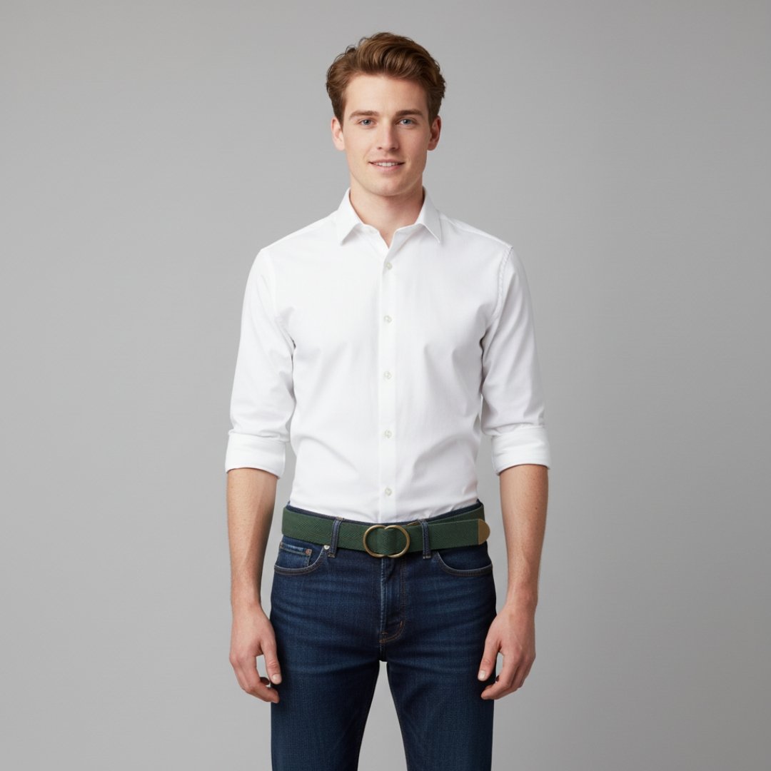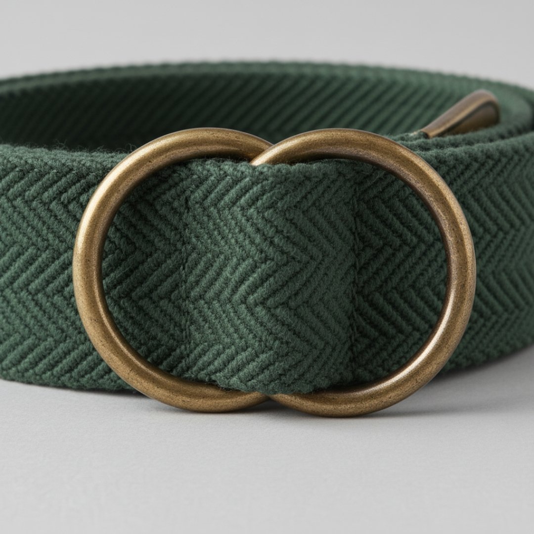 In-Depth Details: The Causeway Cinch is crafted from dense cotton canvas, chosen for its strength, texture, and ability to age beautifully. Each belt is woven to maintain shape and finished with precision stitching that blends seamlessly with the Forest Moss tone. The antique brass D-rings are both practical and decorative — inspired by old-world craftsmanship yet suited to modern style. The result is a belt that feels substantial, grounded, and timeless.